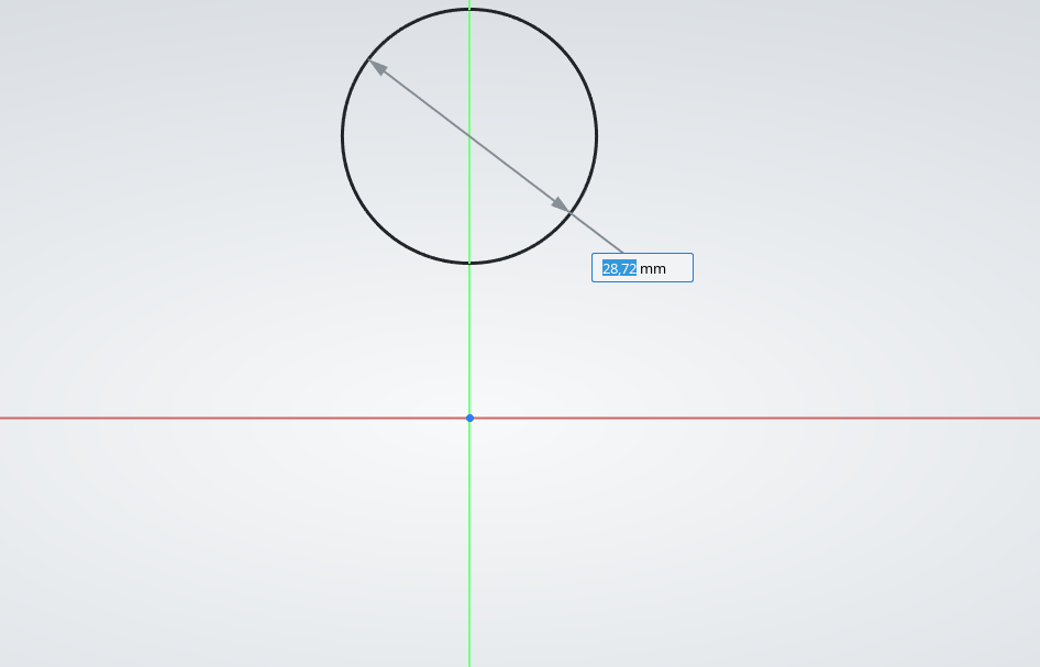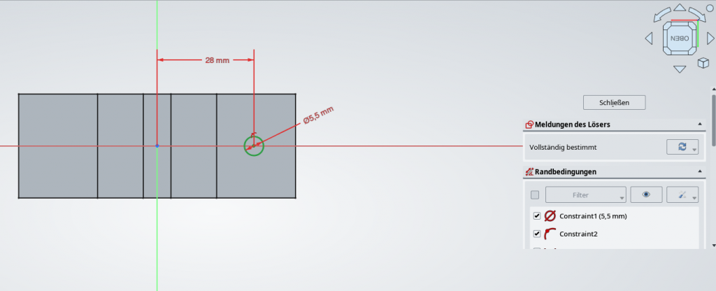 Auf der Skizze muss nun lediglich ein Kreis eingezeichnet werden mit einem bestimmten Abstand zur Mitte und der auf der X-Achse gefangen ist. Der Durchmesser des Kreises ist eigentlich egal, aber es sollte ein Maß eingetragen werden, damit die Skizze vollständig bestimmt ist. Hier wird das Durchmesser-Maß der Durchgangsbohrung eingetragen, welches bei M5 dem Maß ⌀5,5 mm entspricht. Der Abstand zur Mitte soll mit 28 mm vorgegeben sein.