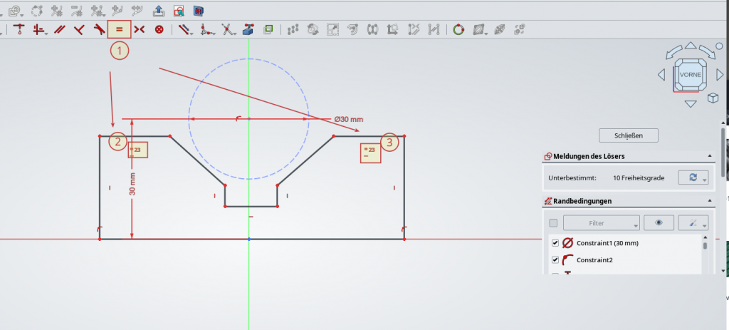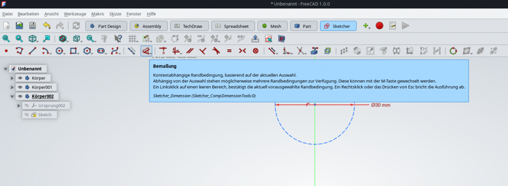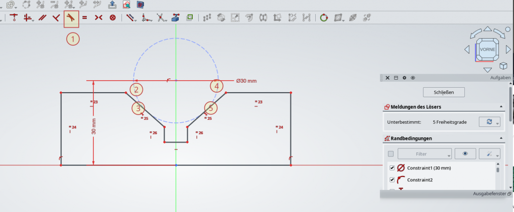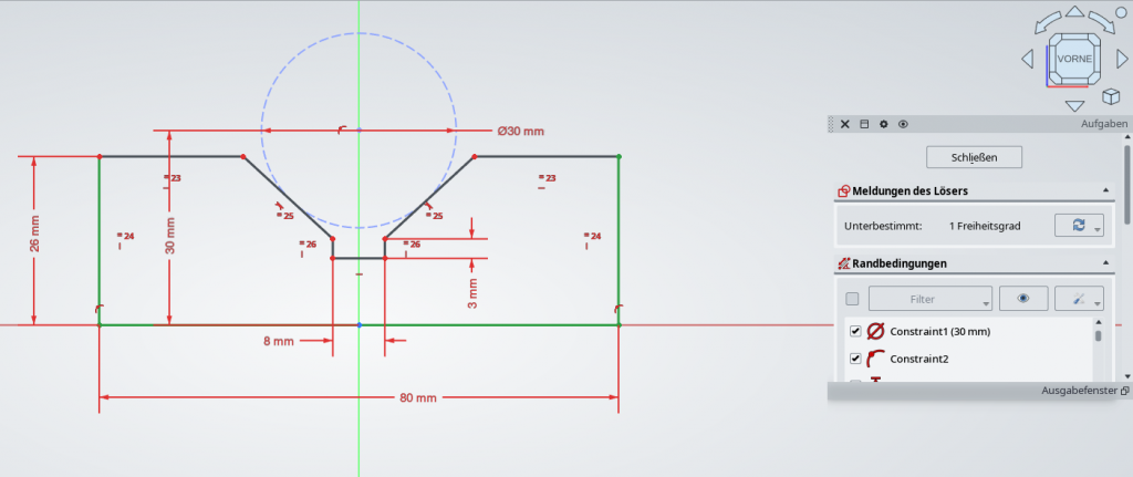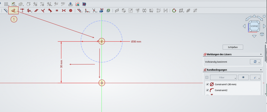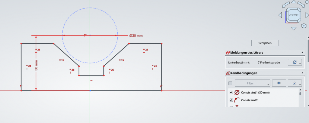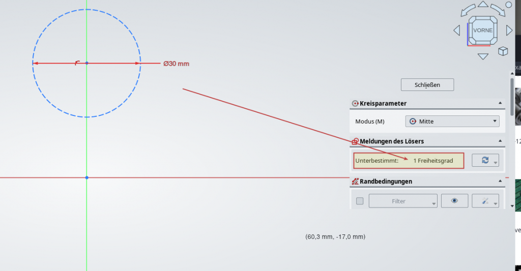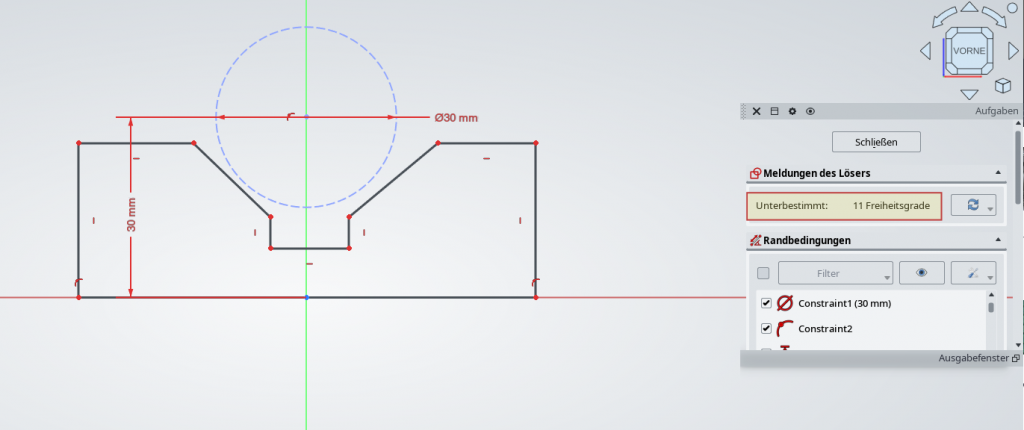 Es kann auch gleich der Durchmesser eingetragen werden, z. B. 30 mm. Eine Skizze soll möglichst immer vollständig bestimmt werden, d. h. es dürfen keine Freiheitsgrade mehr vorhanden sein. Dies wird in der Aufgabenliste angezeigt.