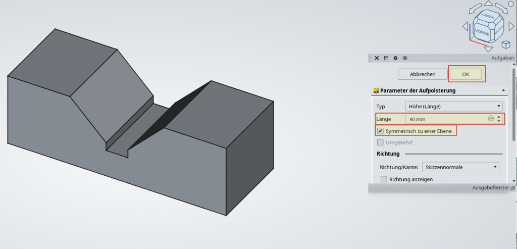 Sobald die Skizze verlassen wurde, werden in der Aufgabenliste die möglichen Befehle angezeigt, die nun auf die Skizze angewendet werden können. Das Prisma wird durch eine Extrusion senkrecht zur Zeichenebene erzeugt. In FreeCAD heißt dies „Aufpolsterung“. Die Dicke soll 30 mm betragen und symmetrisch zur Skizzen-Ebene erfolgen.