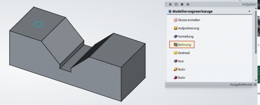 Nach dem Verlassen der Skizze werden in der Aufgabenliste wieder die möglichen Operationen angezeigt und hier soll das Bohrung-Feature verwendet werden.