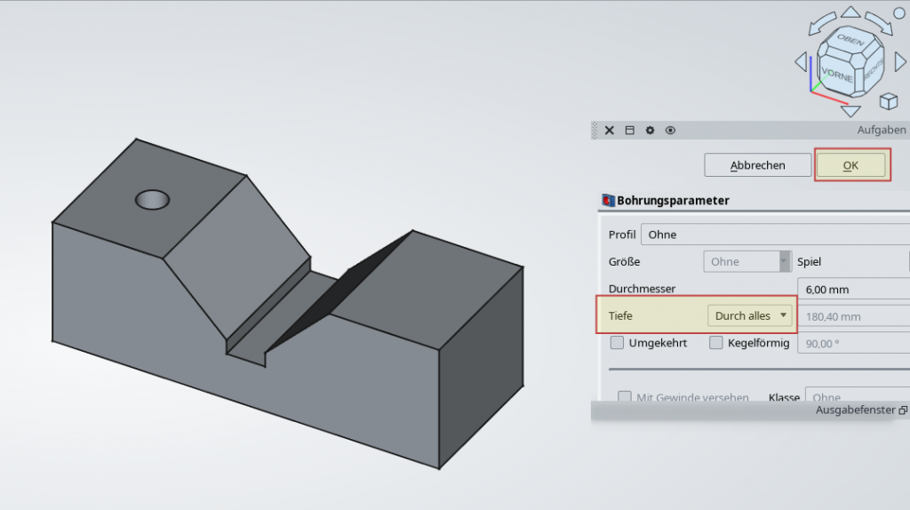 Als Tiefe muss „Durch alles“ ausgewählt werden, da es sich um eine Durchgangsbohrung handelt. mit „OK“ wird der Bohrungsbefehl verlassen.