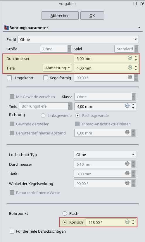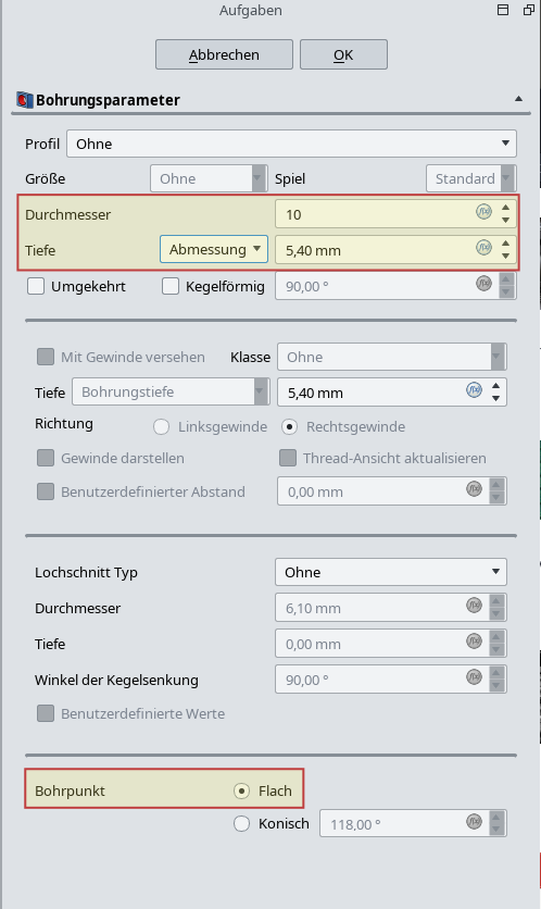Damit die Zylinderschraube versenkt werden kann, muss nun noch eine Senkung erzeugt werden. Dazu kann mit Hilfe derselben Skizze eine weitere Bohrung erzeugt werden, die einen Durchmesser von ⌀10 mm und einer Tiefe von 5,4 mm. Der Bohrungsgrund muss flach ausgeführt werden.