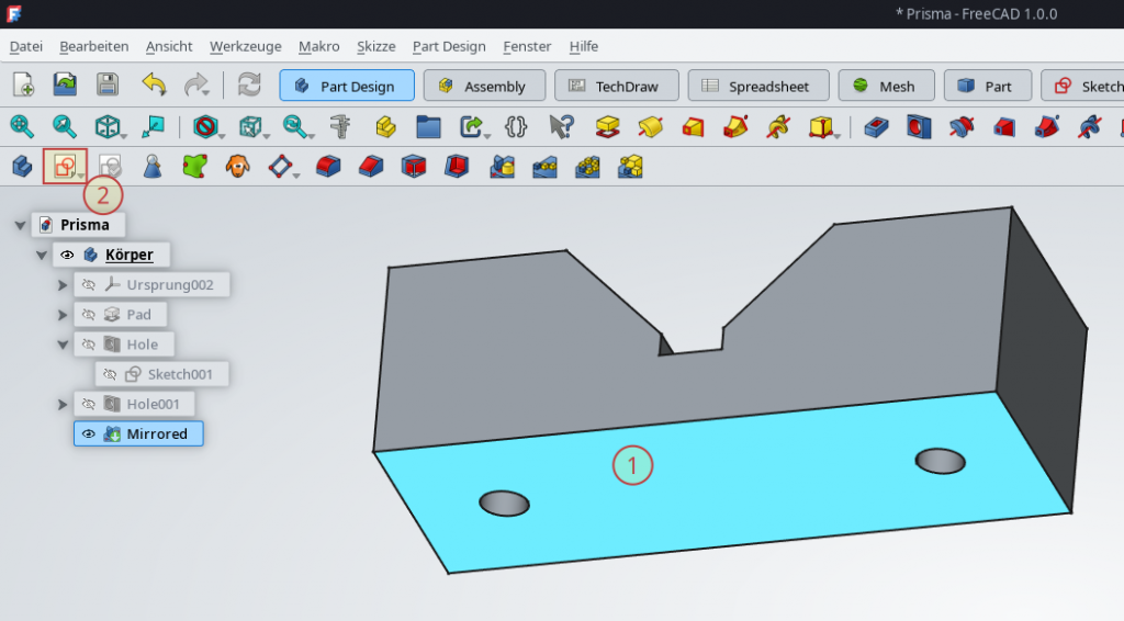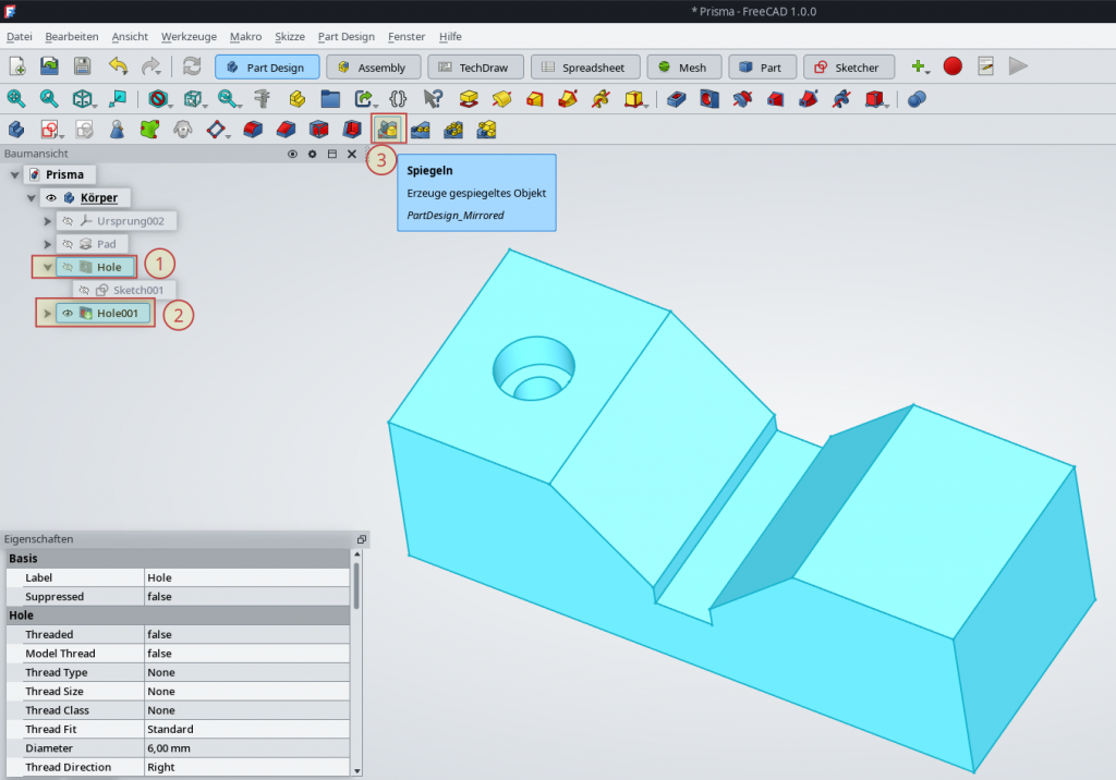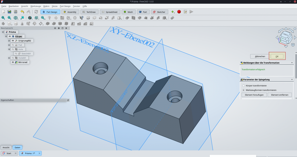 Die Bohrung kann nun gespiegelt werden. Es ist wichtig, dass zunächst beide Bohrungen, Durchgangsbohrung und Senkung ausgewählt werden und dann der „Spiegeln“-Befehl. Es wird zur YZ-Ebene gespiegelt.