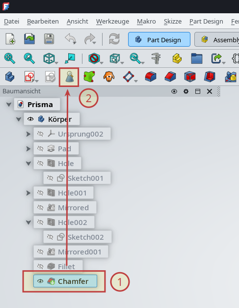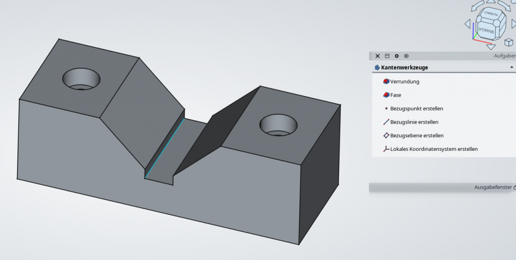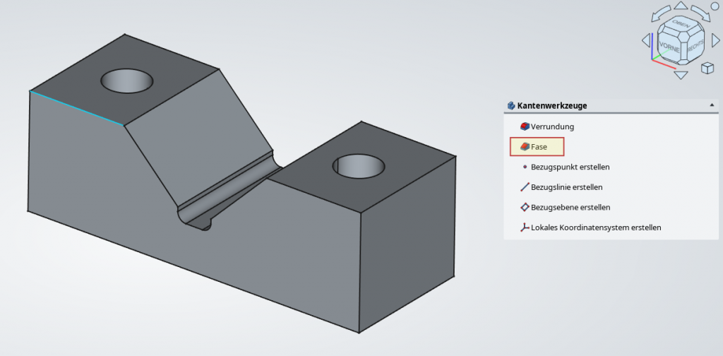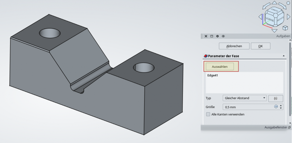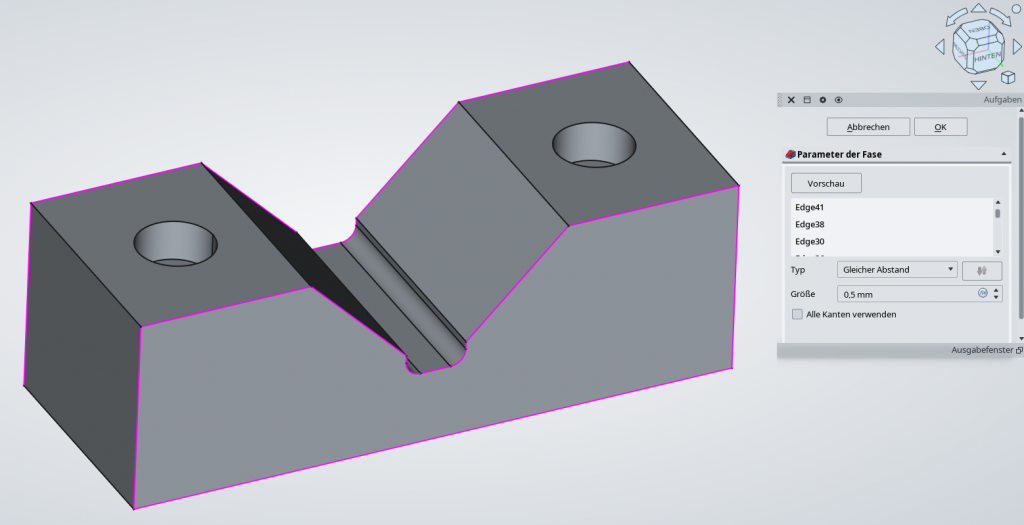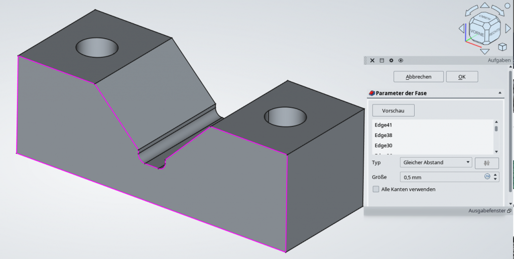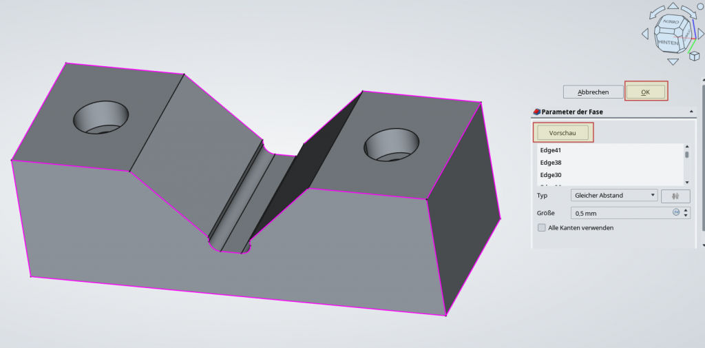 Zum Schluss sollen noch Fasen von 0,5 mm angebracht werden, um das Verletzungsrisiko zu senken. Dazu können entweder gleich alle oder besser zunächst nur eine Kante angeklickt werden und dann der „Fase“-Befehl angewendet werden.