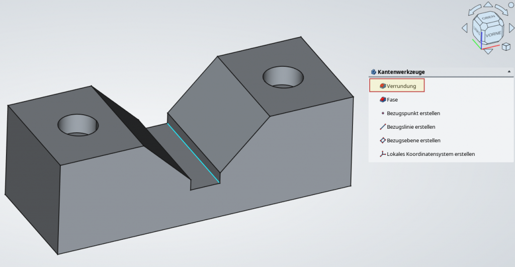 Um Spannungsspitzen zu reduzieren, werden in der Mitte noch Radien hinzugefügt. Dazu werden mit gedrückter STRG-Taste nacheinander die entsprechenden Kanten angeklickt und der „Verrundung“-Befehl angewendet.