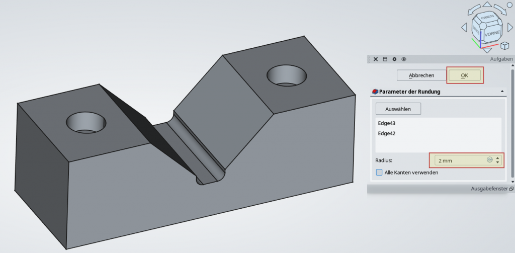 Es werden 2 mm als Radius eingetragen und der Befehl mit „OK“ verlassen