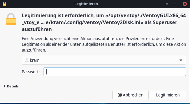 Um Ventoy auszuführen, sind erweiteret Rechte erforderlich.