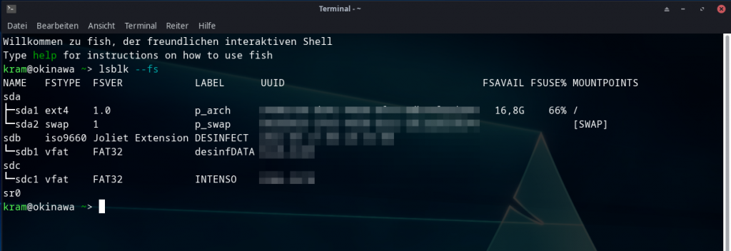 Wenn ein USB-Stick eingesteckt ist, wird dieser erkannt. Wenn mehrere USB-Sticks eingesteckt sind, sollte man sich vergewissern, dass man den richtigen auswählt. Dazu kann man sich mit lsblk --fs