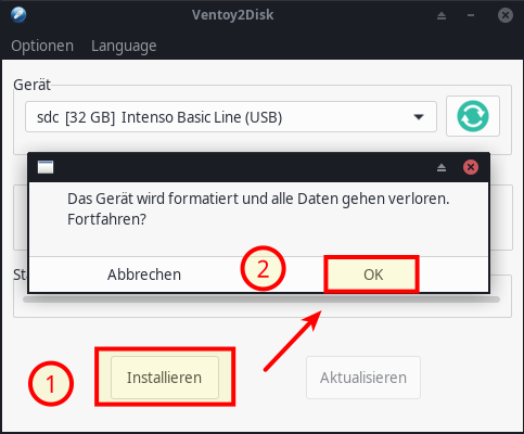 Sobald der richtige Stick ausgewählt ist, kann die Installation gestartet werden.