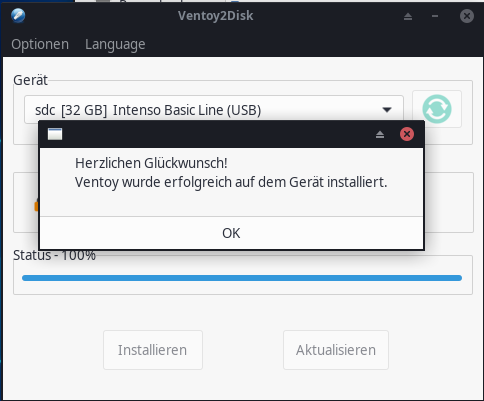 Ventoy wurde hierbei in den Bootbereich des USB-Sticks geschrieben und kann zukünftig aktualisiert werden, ohne dass die darauf befindlichen Daten verloren gehen.