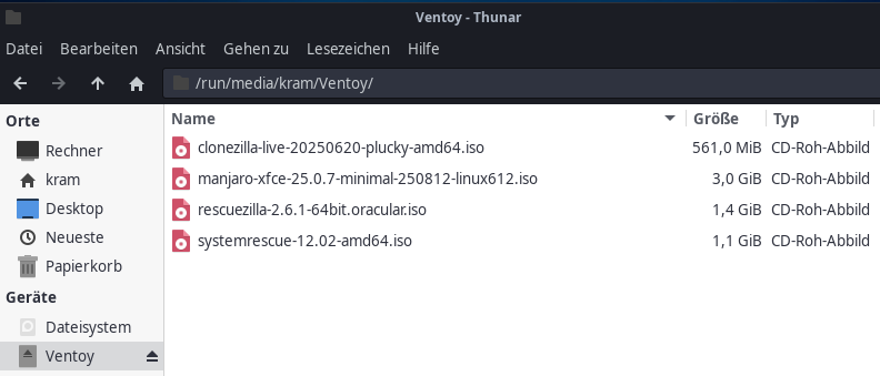 In den Datenbereich des Ventoy-Sticks können nun einfach bootbare ISO-Images kopiert werden, z.B. Live-Medien zu diversen Linux-Distributionen, Rettungstools wie SystemRescue, Rescuezilla oder Clonezilla
